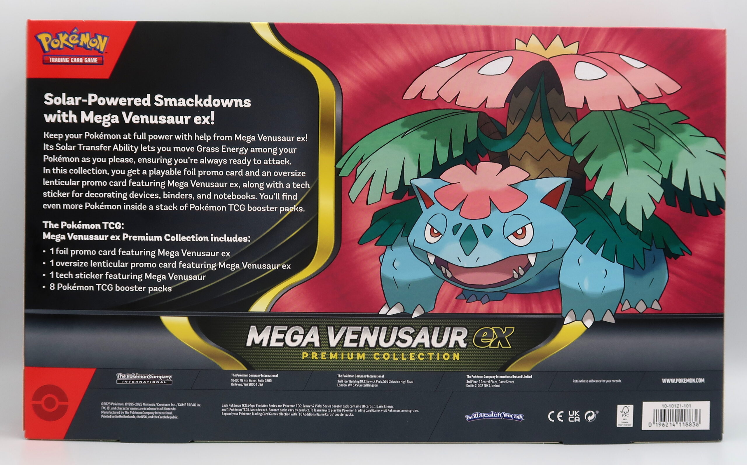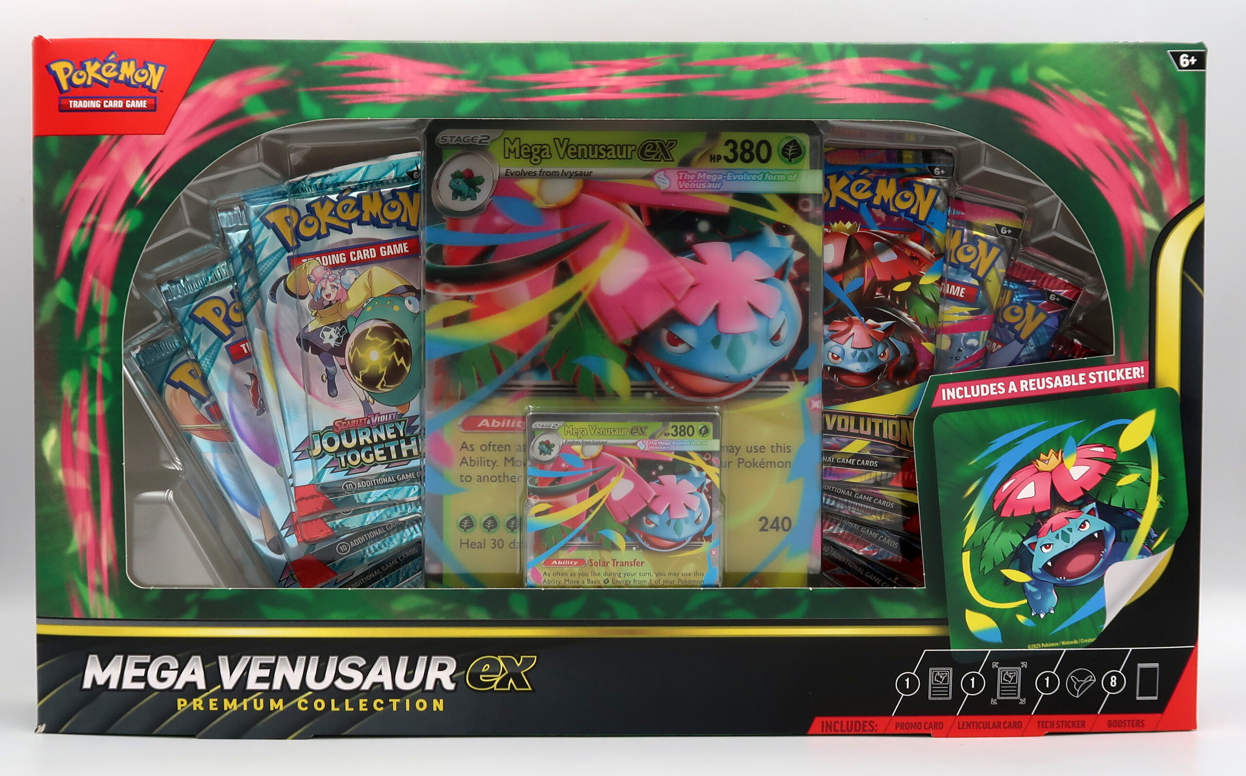 W tym kolekcjonerskim zestawie czeka karta promocyjna Mega Venusaur ex, a także efektowna karta lentikularna z trójwymiarowym obrazem oraz wyjątkowa naklejka – świetna ozdoba na laptop, notatnik lub segregator. Na tym jednak atrakcje się nie kończą, bo w środku znajdziesz również aż 8 boosterów Pokémon TCG pełnych nowych odkryć.